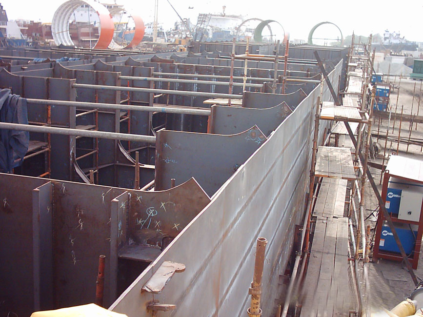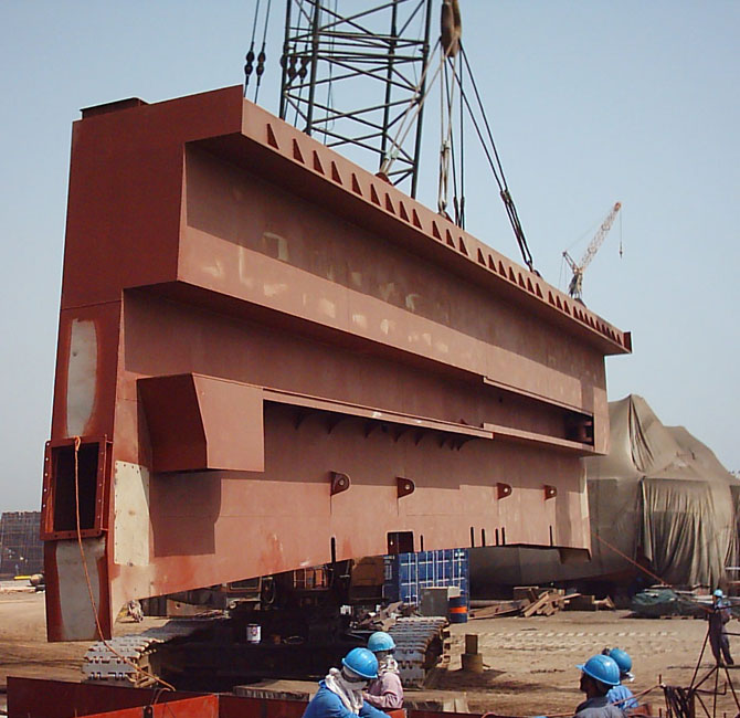 Among various conversion jobs that we have completed are those for M/s. Drydocks World – Dubai including the vessels “MYSTRAS”, “XIKOMBA”, “KNOCK ADOON” and “NAVION BERGEN”. Our work on “MYSTRAS” included complete refurbishment of accommodation, erection of platforms connecting accommodation to the funnel deck, and installation of railings. The 75MT of work carried out “NAVION GUTENBURGH” shall remain memorable because of the variety of jobs undertaken. The ability to work from scratch, flawlessly executing complex requirements, even when confronted with severe time limitations, has made us one of the preferred contractors for such conversion works. We are proud to have been the major contractor for the “BLACKFORD DOLPHIN” project and “HAM 602”carried out in M/s Arab Heavy Industries in the year 2006. In BLACKFORD DOLPHIN project we undertook the fabrication of new blister tanks weighing 250MT, and the fabrication and welding of 70MT new riser columns for M/s Keppel Fels. The fabrication, erection and welding of new partition bulkheads for the stone dumper “HAM 602” owned by Van Oord was another major milestone. Other notable structural repair and erection works there, include the 35MT repairs on NPCC jack-up Barge “SEP 350”, 50MT repairs on “THEBAUD SEA” and Jack-up leg repairs on “EMIRATES PROVIDER”. These jobs underwent rigorous inspection, including full radiographic testing, successfully. These jobs have helped us conclusively prove our capability and set new internal benchmarks in quality and efficiency.